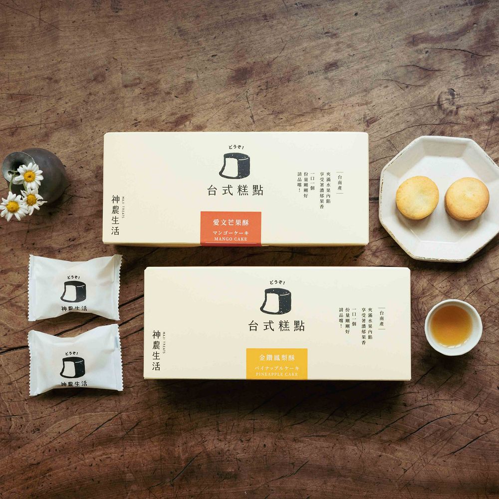 神農生活明星商品組合,國際好友送禮首選!金鑽鳳梨酥採用100%金鑽鳳梨醬製作,加入鳳梨乾增加口感,酸甜鳳梨餡和輕薄香甜的酥皮做搭配,份量精緻輕巧。內餡採用100%台灣愛文芒果泥製作,加入愛文芒果乾增添口感,一口大小的迷你尺寸,吃起來無負擔。