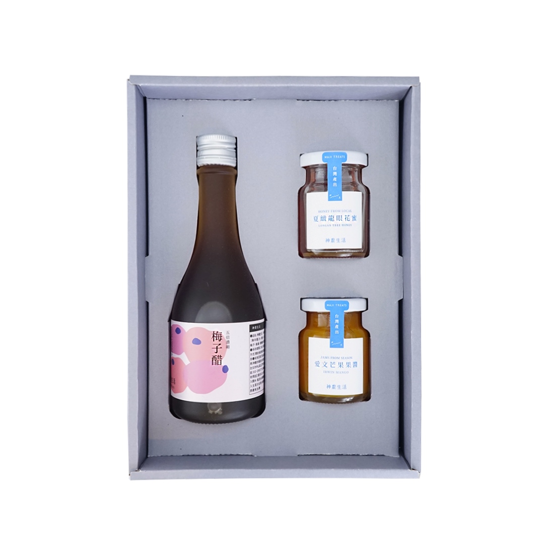 *內容物:梅子醋1入、夏緻龍眼花蜜1入、愛文芒果果醬1入