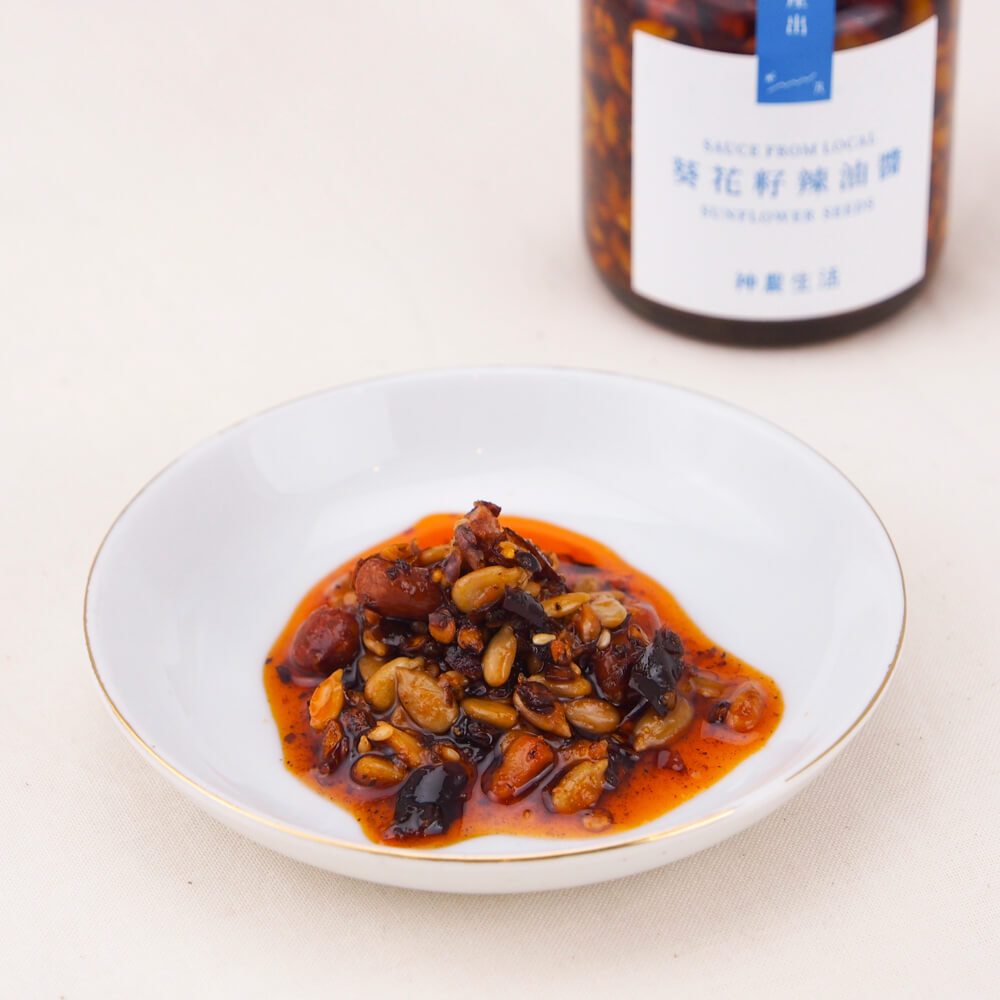 四川の製法と香辛料で調理したひまわりの種ラー油ソース。本場の味が食欲をそそり、辛い物が苦手な方もつい食べたくなります。
