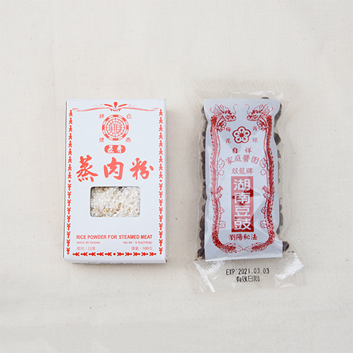 蒸し粉の料理に必要不可欠な一品です。肉を漬けタレと蒸し肉粉と混ぜて、お肉の下にジャガイモ・パンプキンなどのデンプン類の食材を敷いて、鍋で蒸せば完成です。